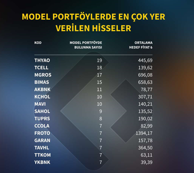 THY 19 aracı kurum, bankanın model portföyünde yer alırken, Turkcell 18 portföyde kendisine yer buldu. Migros 17, BİM 15 ve Akbank 11 model portföyde yer aldılar.