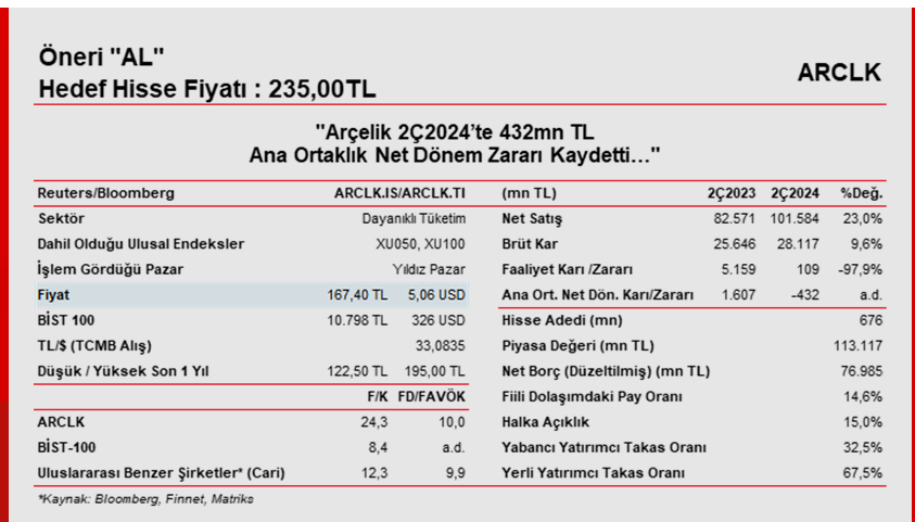 Arçelik’in hedef hisse fiyatını, beklentilerimizdeki güncellemelere bağlı olarak 225,00TL’den 235,00TL’ye yükseltiyoruz. Hisse için daha önceki “AL” önerimizi ise koruyoruz.