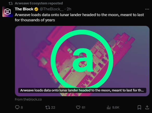 Arweave ayrıca Genesis Block’un LifeShip’in Ay modülüne başarıyla yüklenip fırlatıldığını duyurdu. Ay yüzeyindeki olağanüstü stabilite sayesinde, bu verilerin Dünya’daki hava koşulları veya doğal afetler nedeniyle bozulma riski bulunmuyor. Bu nedenle, gönderilen veriler Ay yüzeyinde binlerce yıl boyunca korunacaktır.