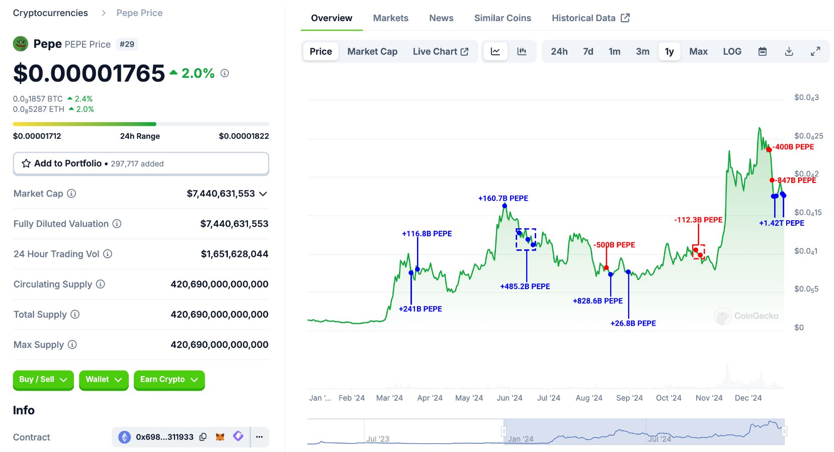 Bu akıllı balina 19 Aralık’taki piyasa düşüşü sırasında tüm PEPE’lerini satarak PEPE’den toplam 11,7 milyon dolar kâr etti! Geçtiğimiz altı gün içinde, piyasadaki düşüşün ardından, balina tekrar 1,42 trilyon PEPE (24,5 milyon dolar) biriktirdi.