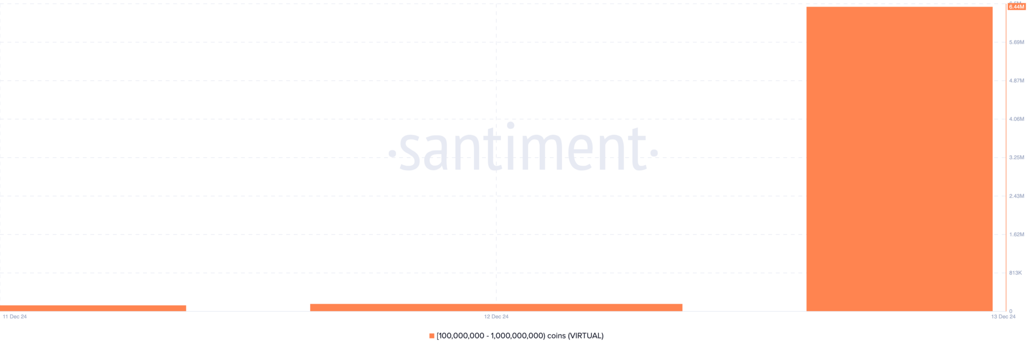 Base zincirinde yapay zeka temelli bir protokol olan VIRTUAL, bu hafta balinaların gözde altcoinlerinden biri oldu. Santiment verilerine göre, 100 milyon ile 1 milyar VIRTUAL token tutan adreslerin bakiyesi, yalnızca bir gün içinde 145.000’den 6,44 milyona çıktı.