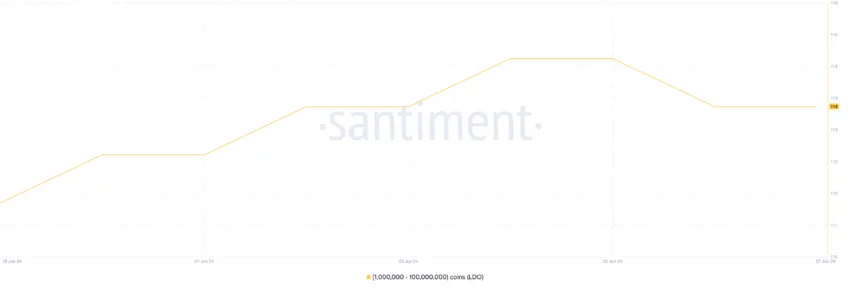 LDO Besleme Dağılımı. Kaynak: SantimentElinde 1.000.000 ila 100.000.000 arasında token bulunduran LDO balinalarının sayısı geçen hafta %2 oranında arttı. Yazı sırasında, LDO balinalarının bu grubu 114 yatırımcıdan oluşuyor. Özellikle de 15 Haziran’da sayıları 111 adresle yılın en düşük seviyesine geriledi. Ancak, birkaç hafta içinde spot ETH ETF’lerinin piyasaya sürülme olasılığıyla birlikte, bu balinalar geçen hafta LDO alımlarını artırdı.