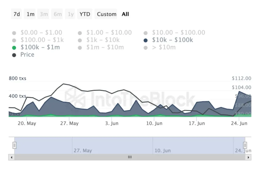 Popüler bir merkezi olmayan kripto kredisi olan Aave’nin yönetim tokenı AAVE, balina işlem hacminde bir artışa tanık oldu. Geçtiğimiz ay, 10.000 ila 100.000 dolar arasındaki AAVE işlemlerinin günlük sayısı %128 oranında arttı. Benzer şekilde, 100.000 ila 1 milyon dolar arasındaki daha büyük işlemlerin sayısı da aynı dönemde %186 oranında artış gösterdi.