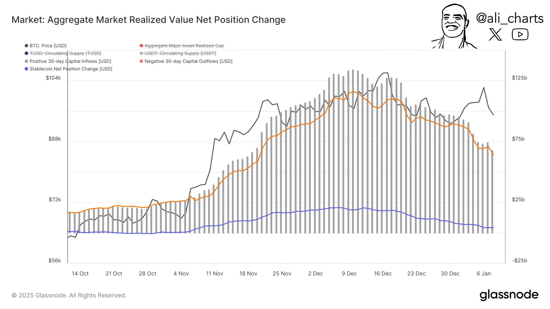 Her ne kadar XRP ve Dogecoin büyük bir hareketlilik yaşasa da, kripto piyasası genel anlamda bir durgunluk içinde. Martinez, son 30 gün içinde piyasaya giren sermayenin 134 milyar dolardan 68 milyar dolara düştüğünü belirtti. “Sermaye girişlerinde yüzde 49’luk bir düşüş var,” diye ekleyen analist, bu durumun piyasa geneline temkinli bir hava kattığını söylüyor.
