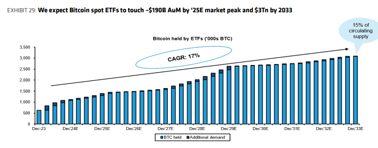 Gautam Chhugani ve Mahika Sapra müşterilere gönderdikleri bir notta, bu hedefin BlackRock, Fidelity ve Franklin Templeton gibi dünyanın önde gelen varlık yöneticileri tarafından yönetilen spot Bitcoin ETF’ler aracılığıyla daha önce görülmemiş bir talep beklentisinden kaynaklandığını yazdı. Ayrıca, bugün 60 milyar dolar olan yönetim altındaki varlıkların yaklaşık 190 milyar dolara ulaşacağını belirttiler. Bu bağlamda analistler, şu değerlendirmeyi yaptı: