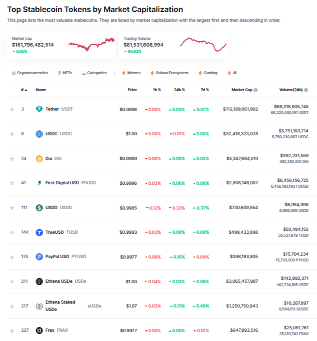 Piyasa değerine göre en büyük ilk 10 stablecoin. Kaynak: CoinMarketCap