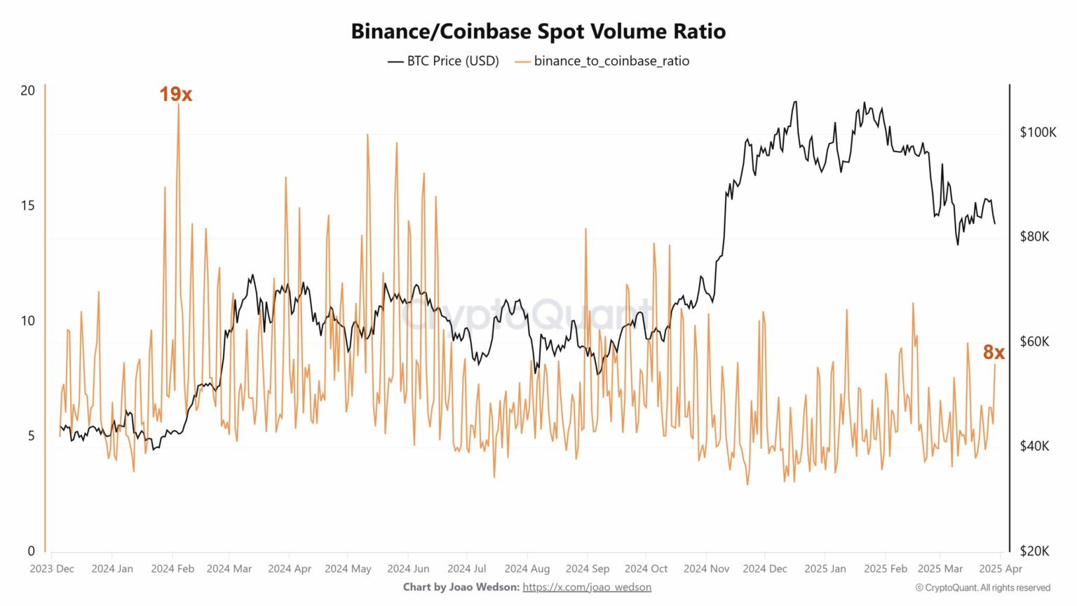 Binance’in işlem hacmi, Coinbase’in hacminin 8 katı seviyesinde bulunuyor. Son iki ayda borsalardaki spot hacim düşmüş olsa da, Binance’in piyasa hakimiyeti yükselmeyi sürdürüyor.