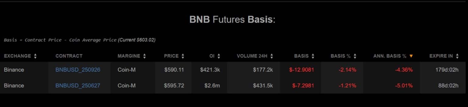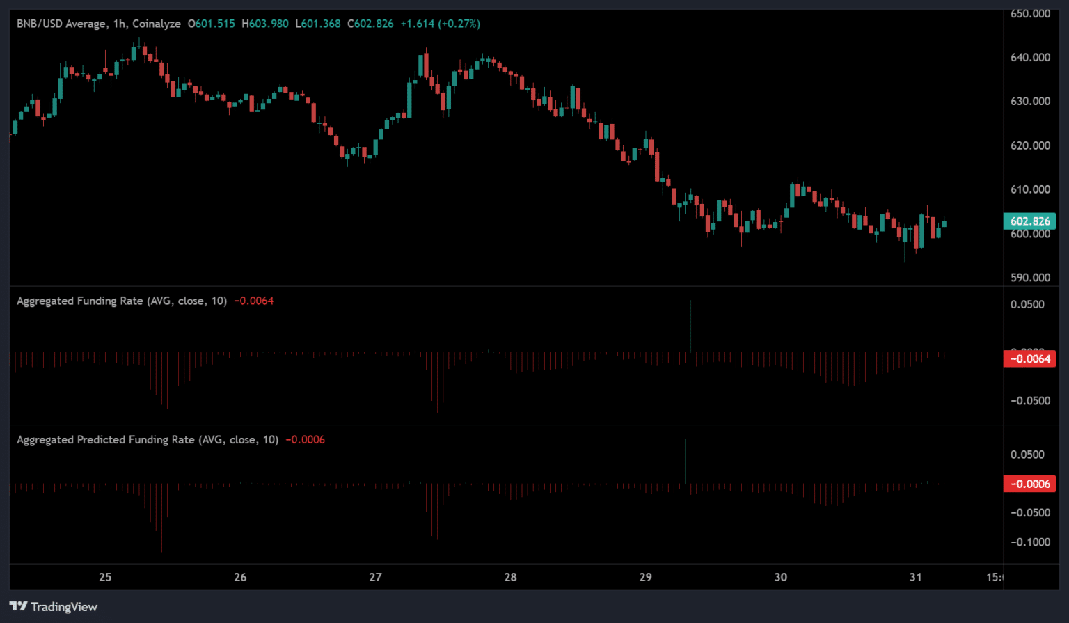 Son haftalarda, BNB’nin Birleşik Fonlama Oranı da negatif seyrediyor. Bu da, birçok yatırımcının kısa pozisyon aldığını ve düşüş beklentisinin arttığını gösteriyor. Kısa pozisyon alanlar uzun pozisyon alanlara ödeme yapıyor ve bu da fiyat düşüşü beklentisinin sürdüğünü ifade ediyor.