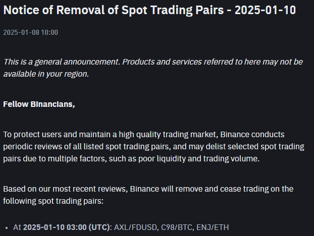 Binance, 8 Ocak tarihinde yaptığı açıklamada, Axelar (AXL), Coin98 (C98) ve Enjin Coin (ENJ) için bazı spot işlem çiftlerini 10 Ocak itibarıyla kaldıracağını duyurdu. Bu işlem çiftleri arasında AXL/FDUSD, C98/BTC ve ENJ/ETH yer alıyor.