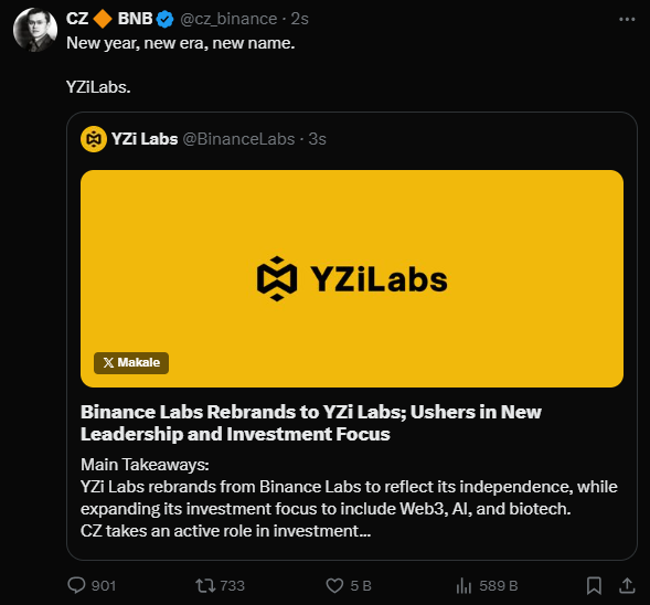 Binance Labs, sosyal medya platformu X üzerinden isim değişikliğini dünyaya duyurdu. Şirket, yaptığı açıklamada adını YZi Labs olarak değiştirdiğini duyurdu. Ayrıca, Binance markasından ayrılmanın yatırım odağındaki genişleme stratejisine uygun olduğunu belirtti. YZi Labs, artık yalnızca kripto ve blokzincir alanında değil. Aynı zamanda yapay zeka ve biyoteknoloji gibi sektörlerde de faaliyet göstermekte.