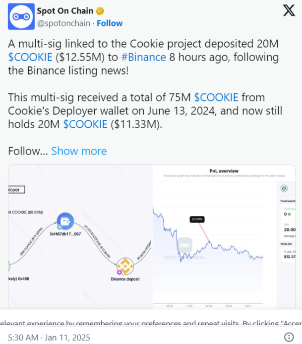 Dünyanın en büyük kripto para borsası olan Binance, kısa süre önce COOKIE tokeni listesine ekledi. Bu gelişmenin ardından token fiyatı keskin bir artış gördü. Bu durumu fırsat gören bir çoklu imza cüzdanı, milyonlarca COOKIE tokenını borsalara yığdı. COOKIE token fiyatı, büyük satışın ardından yüzde 27,5 düşerek piyasa etkisine işaret etti. Mevcut durumda COOKIE’nin piyasa değeri 157,72 milyon dolar ve toplam arzın yüzde 30,12’si dolaşımda.