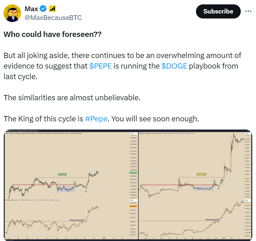 Teknik analizler memecoinler için genellikle hatalıdır. Bununla birlikte, bazı kripto traderları Pepe için daha fazla yükseliş öngörüyor. Because Bitcoin CEO’su Max Schwartzman’a göre Pepe, mevcut boğa koşusunun Dogecoin’i olması mümkün. Bu da onu “bu döngünün kralı” yapıyor.