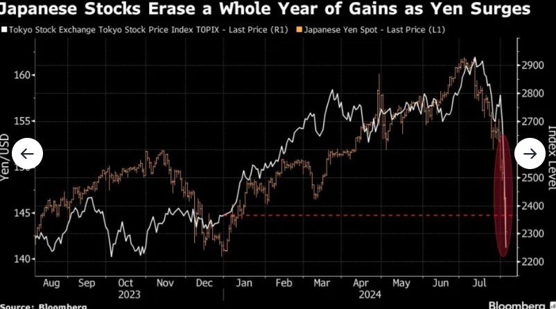 Federal Rezerv’in politika desteği konusunda eğrinin gerisinde kaldığına dair endişeler artıyor ve küresel yatırımcılar risk varlıklarını terk ederek güvenli limanlara yöneliyor. Japon borsasındaki hızlı düşüş, muhtemelen perakende yatırımcılar arasında büyük bir zorunlu satış dalgasını tetikleyerek çöküşü derinleştirdi. Perakende yatırımcıların marj alım pozisyonu, Nikkei tarihi zirvesinden düşerken bile Temmuz ayı sonlarında 18 yılın en yüksek seviyesine yükseldi.