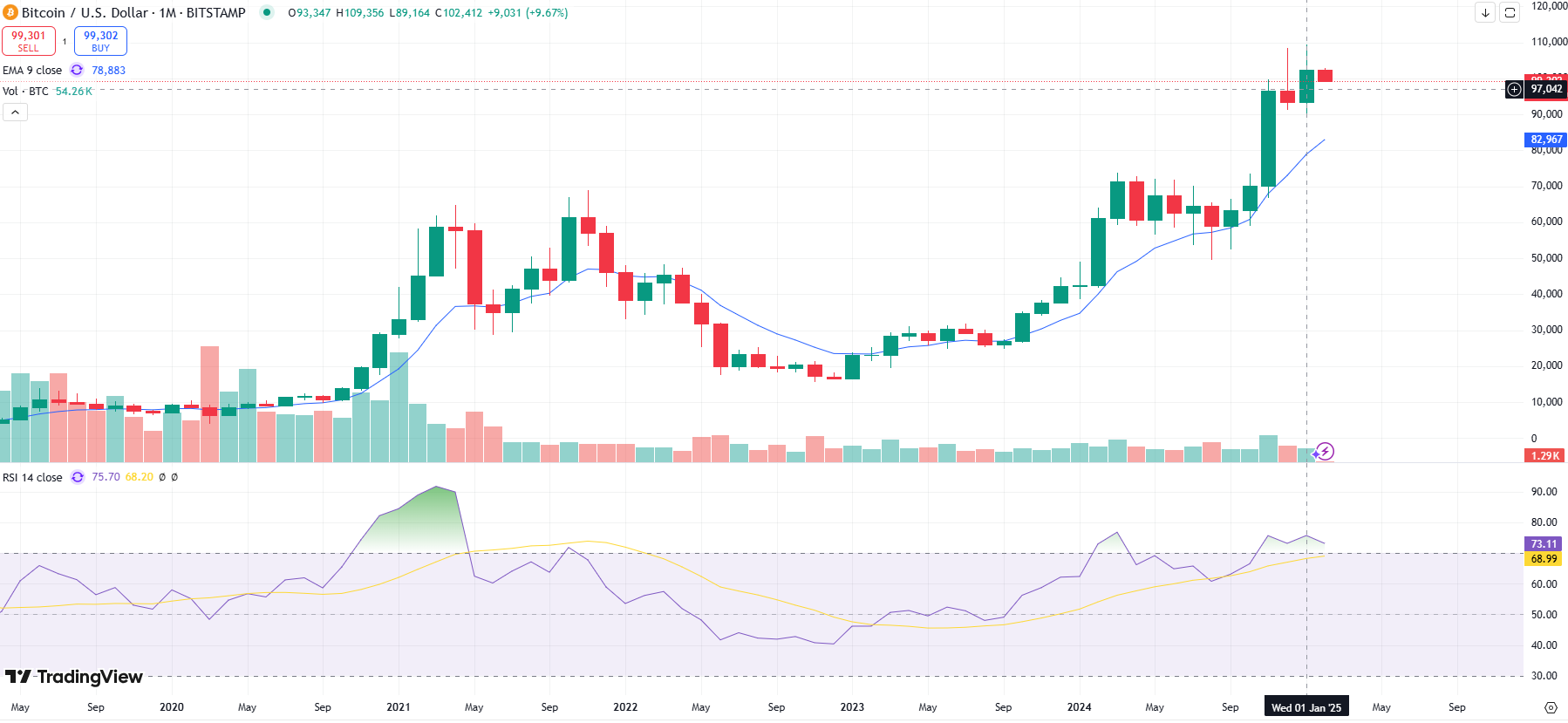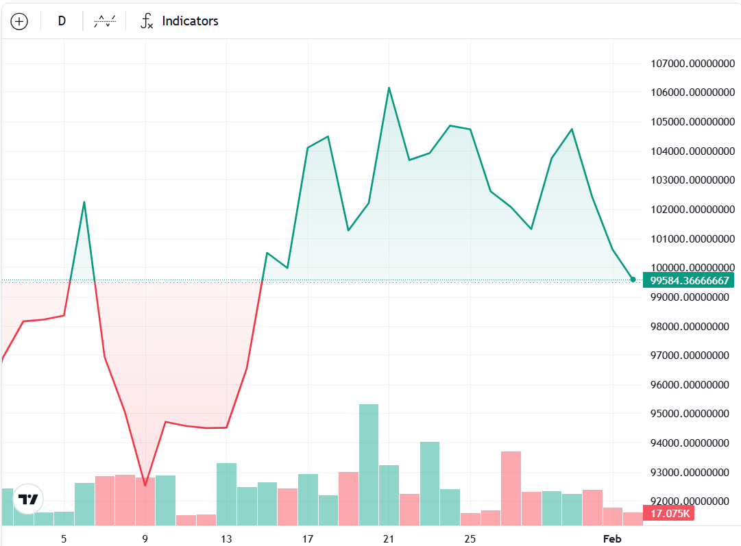Her ne kadar kısa vadede bir düzeltme ihtimali olsa da Bitcoin, Ocak ayında tarihte ilk kez 100 bin doların üzerinde aylık kapanış yaptı. BTC, ayı 102.412 dolar seviyesinde kapatarak Kasım 2024’teki 96.441 dolarlık önceki aylık kapanış rekorunu yüzde 6 oranında aşmış oldu.