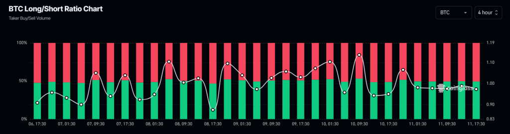 Bununla birlikte, bu düşüş eğilimini on-chain metrikler de destekliyor. Coinglass’ın BTC Long/Short oranı şu anda 0,881 seviyesinde. 1’in altındaki değerler piyasadaki düşüş eğilimini gösterir. Buna ek olarak, BTC’nin gelecekteki açık faizi de %1,5 oranında düştü ve düşmeye devam ediyor. Bu arada, en büyük Bitcoin yatırımcılarının %53,14’ü short pozisyonlara sahip. Diğer taraftan %46,86’sı long pozisyonlara sahip. Bu durum, ayıların şu anda varlığa hakim olduğunu gösteriyor. Ayrıca, ek satış baskısı yaratma potansiyeline sahip olduğunu vurguluyor.