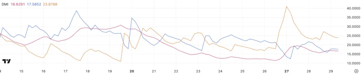 Teknik açıdan, Bitcoin’in DMI (Yönlü Hareket Göstergesi) grafiği, trendin belirgin bir yön kazanmamış olduğunu gösteriyor. Ortalama Yön Endeksi (ADX) 16.6 seviyesinde, son iki gün içinde 15 ile 19 arasında dalgalanarak zayıf bir trend işareti vermekte. Genellikle ADX değeri 20’nin altında olduğunda piyasada konsolidasyon süreci yaşanır, 25’in üzerine çıkması ise güçlü bir trendin oluştuğunu gösterir.