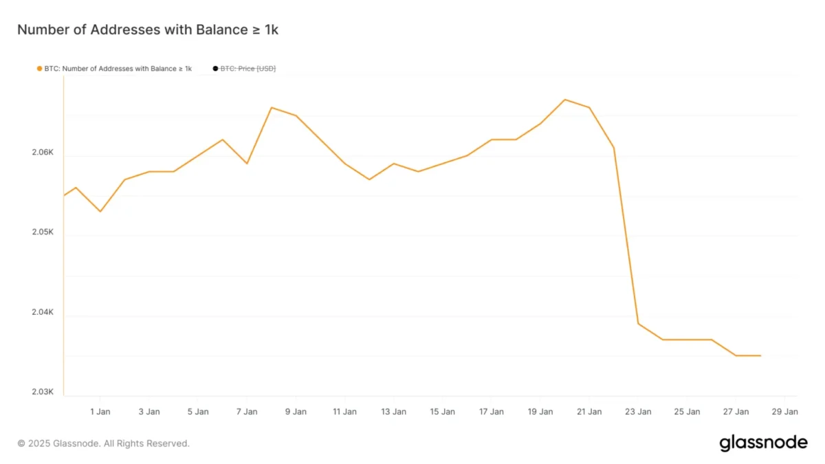 Son analizler, 1.000 BTC ve üzeri varlığa sahip Bitcoin balina adreslerinin sayısının 2.035’e gerilediğini gösteriyor. Bu, Ocak 2024’ten bu yana en düşük seviye olarak dikkat çekiyor. En büyük düşüş ise 20-24 Ocak tarihleri arasında yaşandı ve balina adresleri 2.067’den 2.037’ye düştü.
