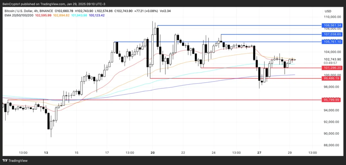 Bitcoin (BTC), piyasa değeri 2 trilyon dolar civarında seyrederken, 101.300 dolar destek seviyesi ve 105.700 dolar direnç seviyesi arasında dar bir bantta hareket etmeye devam ediyor. Son 30 gün içinde %9 yükseliş kaydeden BTC, son bir haftada ise %3 oranında değer kaybetti. Bu dalgalanmaya rağmen, BTC kısa vadeli hareketli ortalamalarının yakın seyretmesi ve Yönlü Hareket Göstergesi’nin (DMI) zayıf bir trend sinyali vermesi nedeniyle konsolidasyon sürecine girmiş gibi görünüyor.