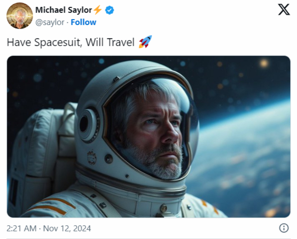 Bu arada, lider kripto para Bitcoin son gün içinde yaklaşık %10’luk bir artışla 89.956 doları gördü. Böylece, tekrar tekrar bu hafta tüm zamanların en yüksek seviyesine ulaştı. Bu görkemli yükselişe tepki gösteren Saylor, uzay giysisi ve kask giydiği, arka planda uzayın ve yörüngeden Dünya’nın göründüğü yapay zeka tarafından oluşturulmuş bir görüntüsünü yayınladı.