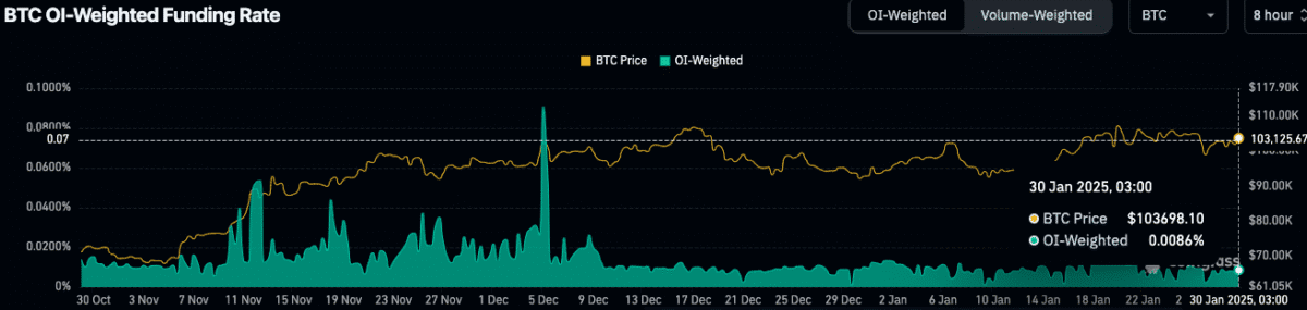 BTC’nin fonlama oranları, kaldıraçlı işlemlerin maliyetini ölçen bir gösterge olarak yatırımcıların yön arayışında olduğunu ortaya koyuyor. Aralık başında fiyat artışıyla birlikte keskin bir yükseliş gören fonlama oranları, şu anda 0,008 seviyelerinde sabitlenmiş durumda.