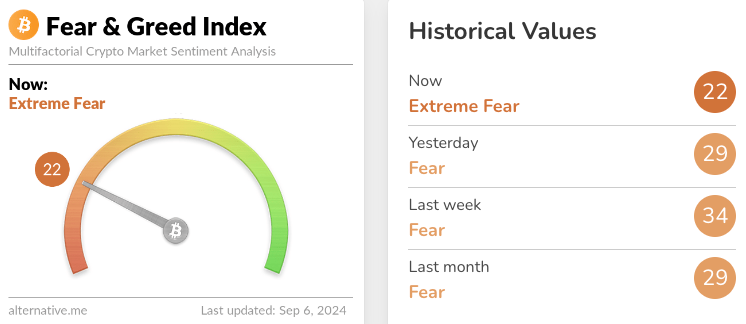 Sonuç olarak, kripto para piyasası, piyasa duyarlılığını ölçen Crypto Fear & Greed Index’e göre “aşırı korku” bölgesine düştü. Endeks 6 Eylül’de 22’ye düşerek “aşırı korku ‘ya işaret etti. Bu, bir önceki günün ’korku” olarak etiketli 29 puanından tam bir tezat. Bu, endeksin 20’ye ulaştığı 8 Ağustos’tan bu yana en düşük skora işaret ediyor.