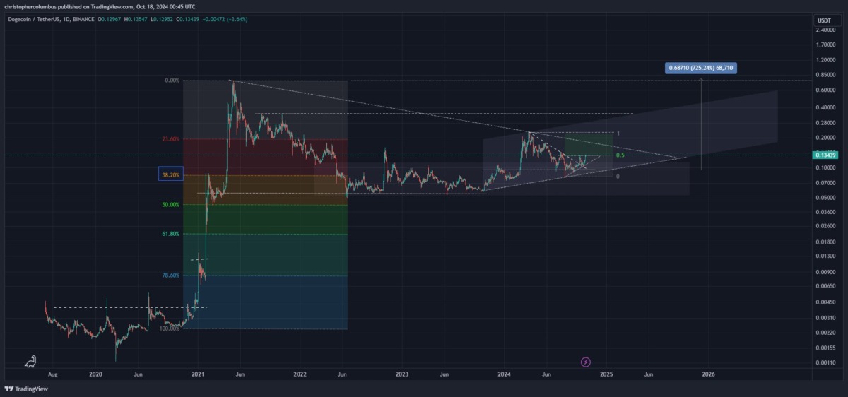 Analist, grafiğine bakarak DOGE’nin daha geniş bir simetrik üçgen modelinde konsolide olduğunu söylüyor. Ayrıca, yakında meme coin’i 0,20 dolar aralığına koyabilecek direnci kırabileceğini de öne sürüyor. Analist ayrıca, DOGE’nin bu döngü sırasında ATH seviyesi olan 0,73 dolara bir ralli yapacağını öngörüyor. Bu arada DOGE, son 24 saatte %0,98 kayıpla yazı sırasında 0,1374 dolardan işlem görüyordu. Bununla birlikte, kripto para, haftalık grafiğinde yaklaşık %20’lik bir kazancın üstünde oturuyor.
