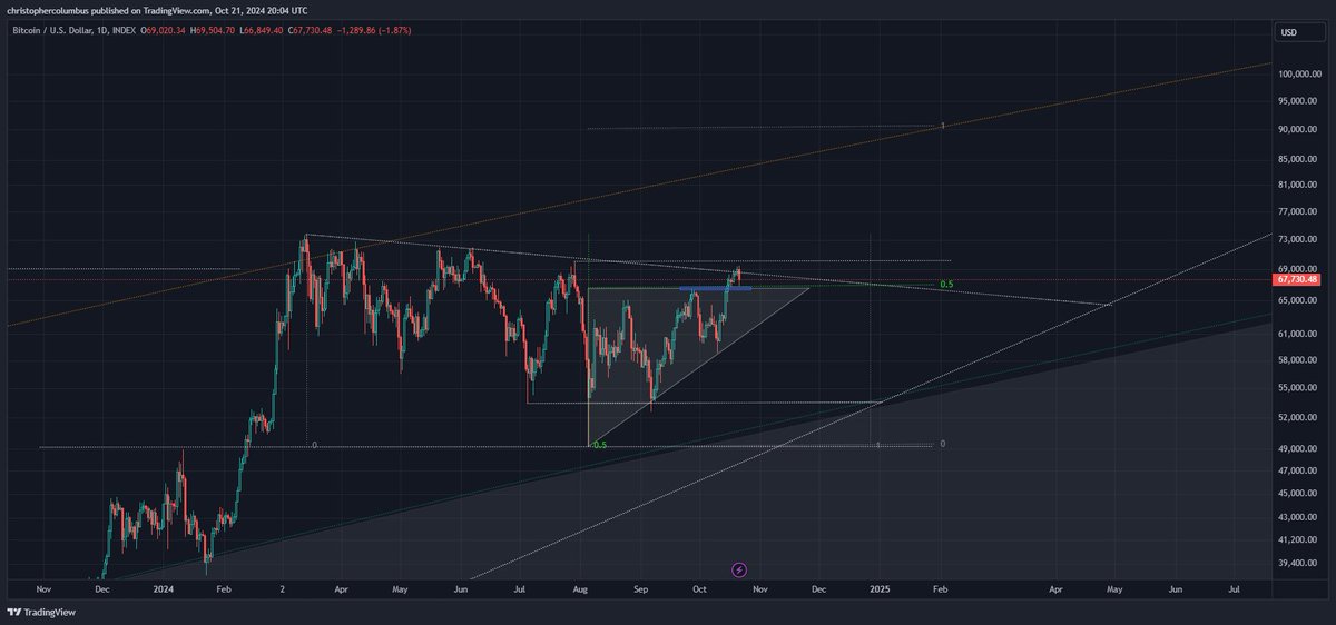 Dave the Wave, daha sonra lider kripto paraya bakıyor. Analist, kalıcı bir direnç seviyesini aşması halinde Bitcoin’in tüm zamanların en yüksek seviyelerine doğru rallileri ateşleyebileceğini söylüyor. Bu bağlamda analist, kripto para için “BTC: 70.000 doları geçerse işimize bakarız… Kısa vadeli. Direnç destek mi oluyor?” diyor.