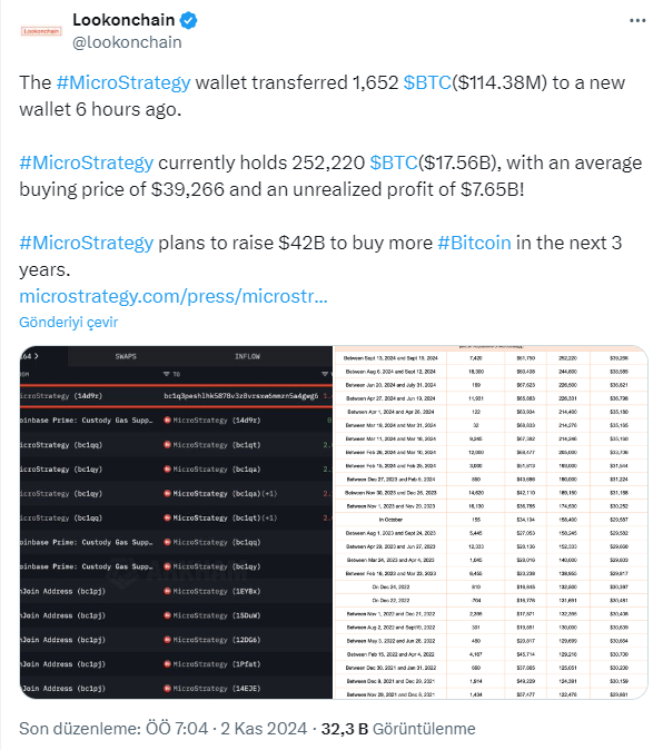 Kriptokoin.com’dan takip ettiğiniz üzere, lider kripto Bitcoin 70 bin doların üzerindeki mevzisini korumada başarısı oldu. Bitcoin’in irtifa kaybetmesi neredeyse bütün piyasayı da aşağı çekiyor. Bu yüzden piyasa oyuncularının bir gözü de Bitcoin’in üzerinde. Büyük Bitcoin varlıklarıyla bilinen MicroStrategy, dijital varlıklarını yönetmek için stratejik hamleler yapmaya devam ediyor. Analitik platformu Lookonchain, MicroStrategy’nin 114,38 milyon dolar değerinde 1.652 BTC’yi yeni bir cüzdana aktardığını bildirdi.
