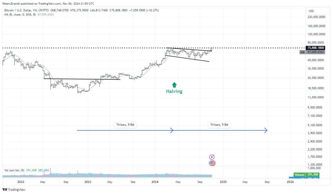 Grafiğine göre analist, tarih tekerrür ederse, Bitcoin’in halving sonrası döngü zirvesine ulaşması için geçecek sürenin, boğa piyasası döngüsünün başlangıcından halving’e kadar geçen süreye benzer olacağını öne sürüyor. Brandt’a göre, Bitcoin 2022 Kasım’da boğa piyasası döngüsüne başlamasıyla bu yılın Nisan ayındaki halving arasında 518 günlük bir süre var. Analist, Bitcoin’in halving’ten mevcut boğa piyasasının döngü zirvesine ulaşmasının muhtemelen 518 gün daha alacağını söylüyor. Bu arada, Bitcoin yazı sırasında 76 bin doların üzerinde işlem görüyor. Lider kripto para haftalık bazda %9,55 artış kaydetti.