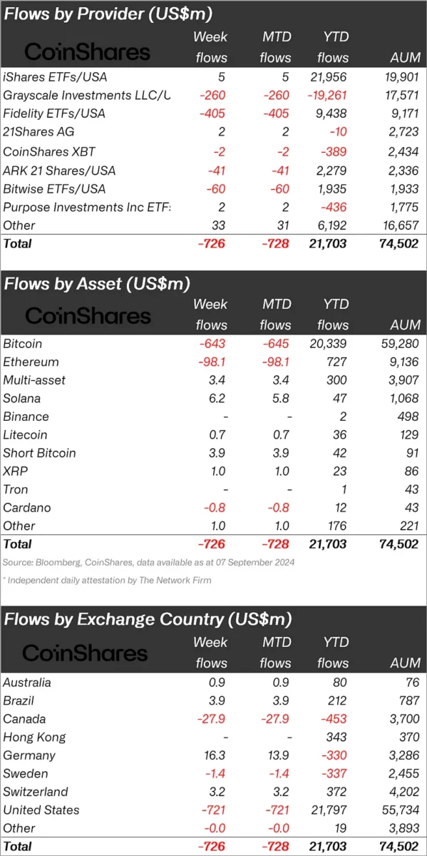 Bölgesel olarak ele alındığında, çıkışlar neredeyse tamamen ABD’ye odaklanmış durumda. ABD’de kripto varlık yatırım ürünlerinden toplamda 721 milyon ABD doları tutarında çıkış yaşandı. Bu, sadece ABD için değil, tüm kripto varlık piyasaları için de dikkat çekici bir rakam. Kanada’da da benzer bir tablo görülmekte. Bu ülkede toplamda 28 milyon ABD doları çıkış kaydedildi.