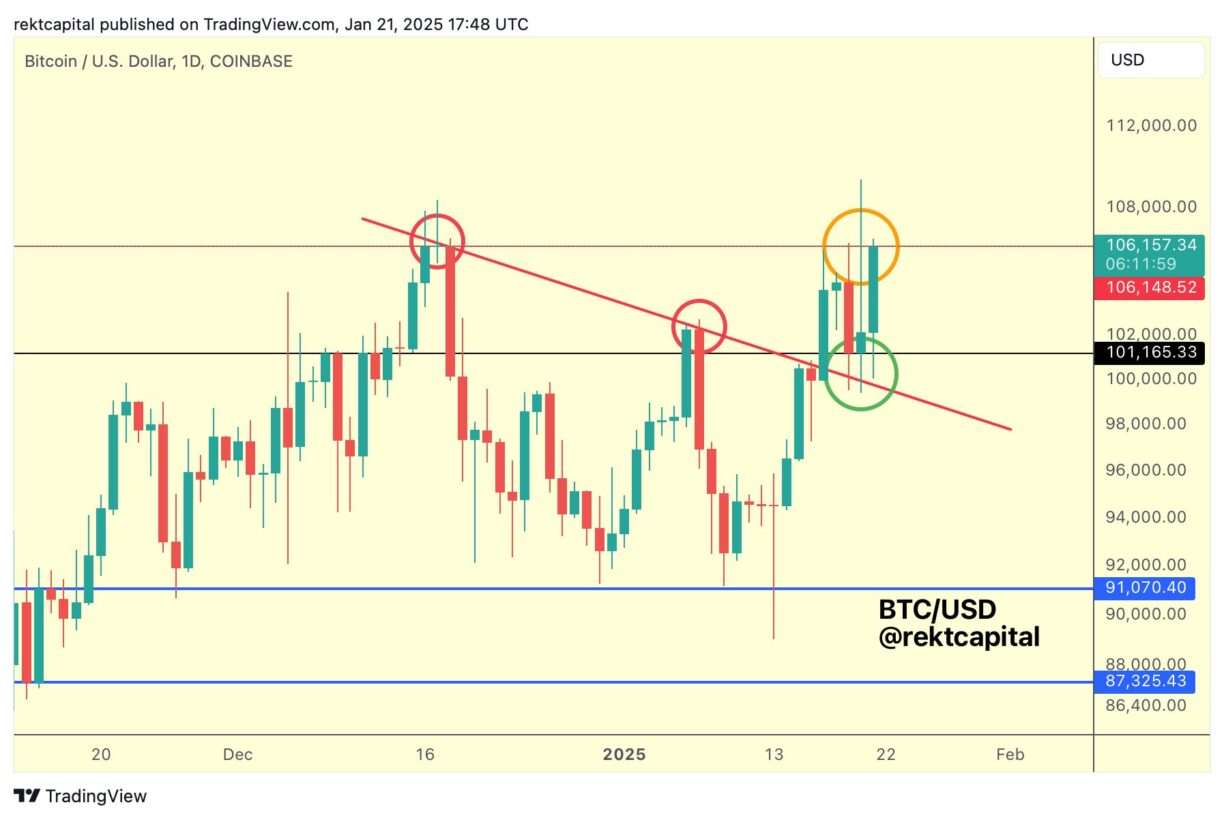 BTC fiyatı 96.703 dolarlık haftalık en düşük seviyesinden tüm zamanların en yüksek seviyesi olan 109.114 dolara kadar yükseldiği için bu hafta Bitcoin için dalgalı geçti. MicroStrategy gibi piyasa liderleri birikmeye devam ederken, bugünkü kazançlarla Bitcoin fiyatı yeni zirvelere ulaşmak için bir girişimde daha bulunuyor. Analist Rekt Capital’in görüşlerine göre Bitcoin, potansiyel bir kırılmaya hazırlanırken 101 bin-106 bin dolar aralığında konsolide oluyor.