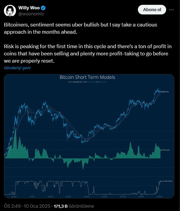 Bitcoin analisti Willy Woo, piyasadaki yükseliş eğilimine rağmen Bitcoin yatırımcılarını temkinli olmaları konusunda uyarıyor. Woo, Bitcoin yerel risk modelinin çok yüksek risk seviyeleri öngördüğünü belirtiyor. Diğer kaynaklar da genel kripto piyasasının hala yükselişte olduğunu gösteriyor. Ancak Bitcoin fiyatı için düşüş yaşanması ve altcoinlerdeki satışların artması, piyasanın yakında tersine dönebileceğinin bir göstergesi olarak değerlendirilebilir. Bununla birlikte, bazı analistler düşüşün kısa vadeli bir ayı anı olduğunu düşünüyor. Özellikle büyümenin beklenenden daha erken başlayabileceğini öne sürüyor.