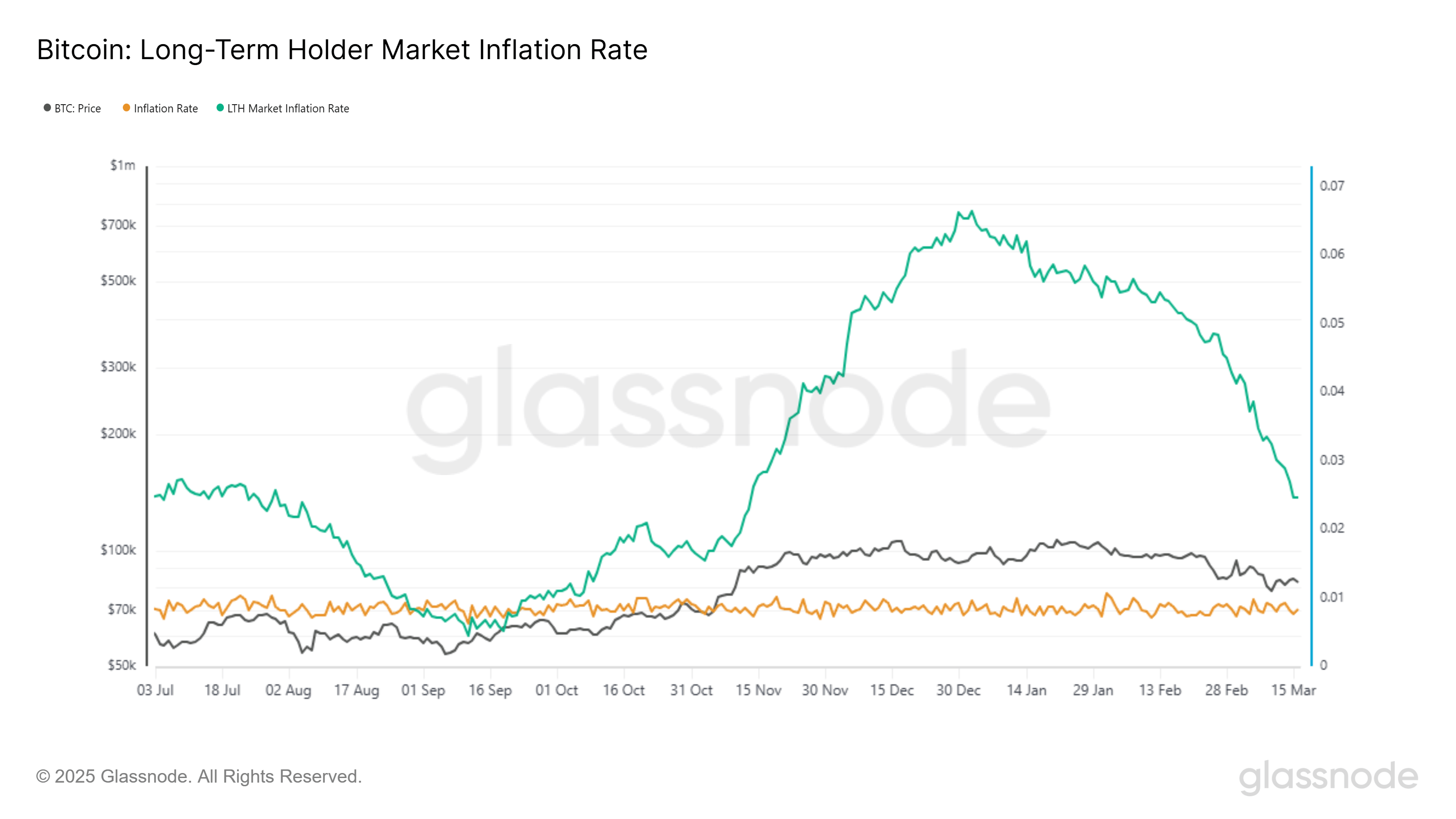 Uzun vadeli yatırımcıların piyasa enflasyon oranı şu anda 0.025 seviyesinde seyrediyor. Bu oran, yıllık bazda Bitcoin arzına kıyasla yatırımcıların satış eğilimini gösterir. Eğer bu oran madencilerin çıkardığı BTC miktarının altına düşerse (0.008 seviyesi), satış baskısı azalabilir ve fiyat yükseliş ivmesini güçlendirebilir.