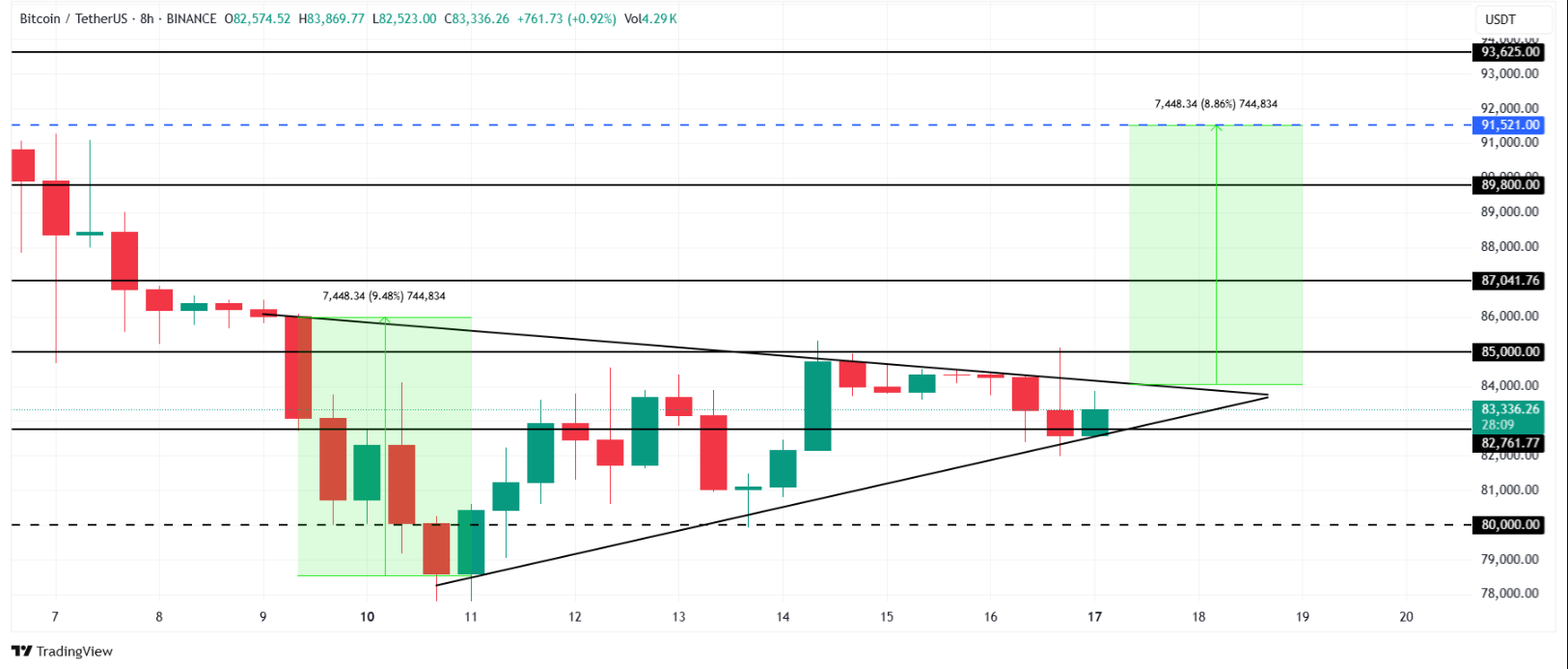 Bitcoin şu anda 83.336 dolar seviyesinde işlem görüyor ve 82.761 dolar destek seviyesini koruyor. Teknik analizlere göre, mevcut simetrik üçgen formasyonu, Bitcoin’in %8.8’lik bir kırılma potansiyeline sahip olduğunu gösteriyor. Eğer BTC 85.000 dolar seviyesini aşar ve 87.041 doları destek haline getirirse, 91.521 dolar hedefi mümkün hale gelebilir.