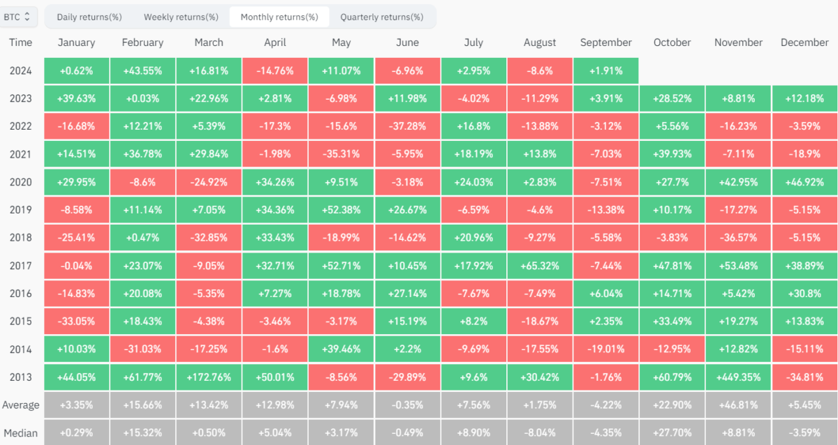 Bitcoin fiyat hareketlerine bakıldığında, Eylül ayının genellikle kripto para için zayıf bir performans sergilediği biliniyor. CoinGlass verilerine göre, Eylül ayı tarihsel olarak Bitcoin’in en düşük getiri sağladığı ay olarak öne çıkıyor. Ortalama olarak Eylül ayında Bitcoin fiyatı %4.69 oranında bir kayıp yaşıyor.