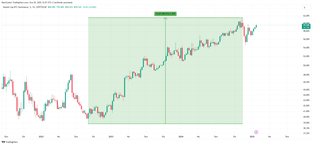Bitcoin’in toplam kripto para piyasa değeri karşısındaki hakimiyetini ölçen BTC Dominance Endeksi (BTC.D), Ocak ayında %15,4 artarak %59 seviyesini aştı. Son üç yılda ise Bitcoin’in piyasa hakimiyeti %58 yükseldi.