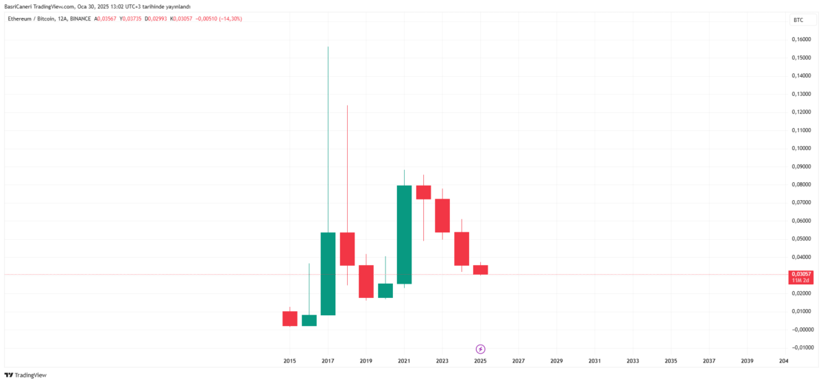 Teknik analizlere göre ETH/BTC paritesi 0,030 BTC seviyesini test edebilir. Bu destek korunamazsa, Ethereum’un 0,023 BTC seviyesine kadar gerilemesi mümkün. Tersine, bir toparlanma yaşanırsa 0,040 BTC seviyesine doğru bir hareket beklenebilir.