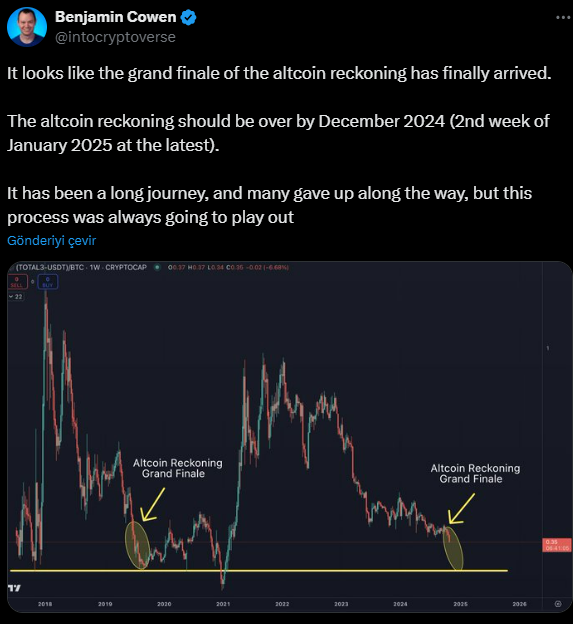 Bitcoin ve kripto analisti Benjamin Cowen’e göre, altcoin piyasasının 2025’in başlarına kadar büyük bir boğa koşusuna girmesi olası değil. ALT/BTC paritesinin önemli bir destek seviyesini kaybetmesi, piyasa için olumsuz bir sinyal. Ancak Cowen, Fed’in para politikalarında değişiklik yapması durumunda altcoinlerde toparlanma şansının olduğunu da ekliyor. Yani, tamamen umutsuz bir tablo çizmiyor; sadece biraz daha sabır gerekecek.