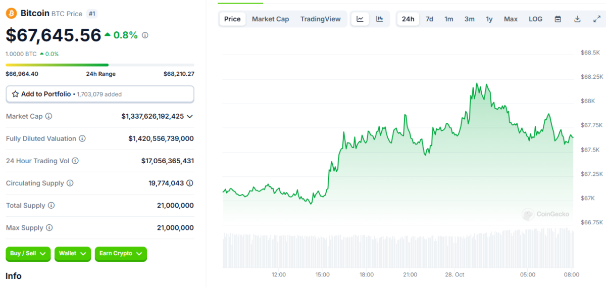 Bitcoin son 24 saatte %1 değer kazanarak 67.670 dolara yükseldi. Bununla birlikte gün içinde 66.964,26 dolar ile 68.221,31 dolar arasında dalgalandı. Ayrıca haftaya olumlu bir başlangıç yapan Bitcoin, özellikle Bitcoin ETF’lerine olan yoğun ilgi sayesinde yükselişini sürdürdü. Sosovalue verilerine göre, geçen hafta Bitcoin ETF’lerine yaklaşık 997,70 milyon dolarlık bir giriş gerçekleşti. BTC’nin toplam piyasa değeri ise 1,34 trilyon dolara ulaşmış durumda. Bitcoin’in piyasa hakimiyeti de %58,24’e çıkmış görünüyor.