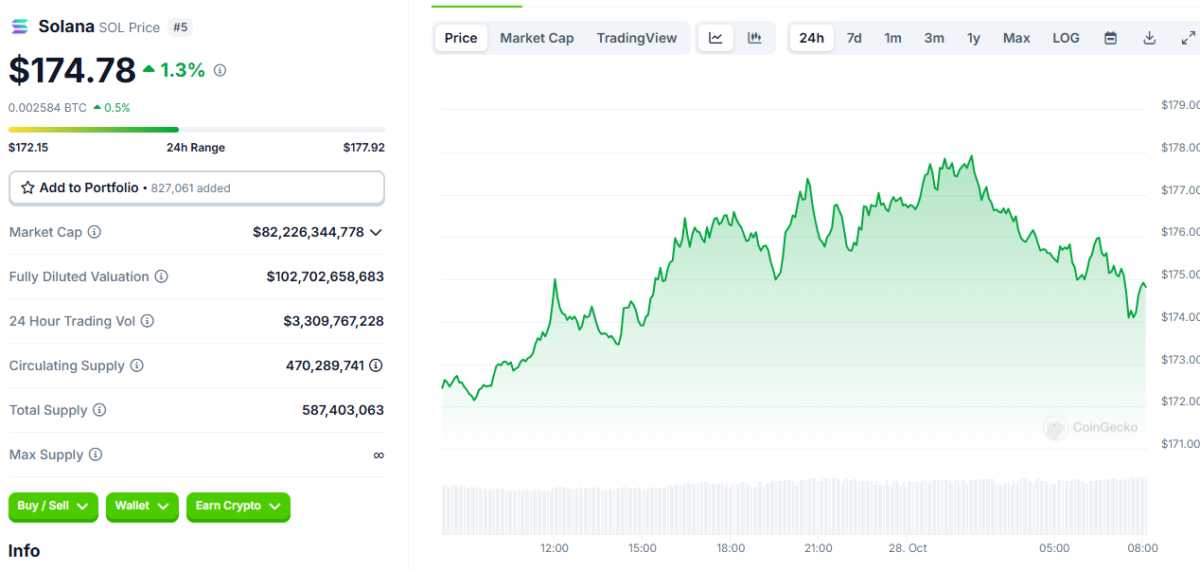 Bitcoin fiyatı ile birlikte SOL’da yükselişe geçti. Solana (SOL), son 24 saatte %2 değer kazanarak 175 dolara çıktı. Gün içi en düşük seviyesi 171,60 dolar, en yüksek seviyesi ise 177,90 dolar oldu. SOL’un piyasa değeri 82,43 milyar dolara yükseldi. Binance üzerinde artan SOL staking işlemleri, bu yükselişe önemli katkı sağladı. Yatırımcılar, Solana’nın performansını yakından izlemeye devam ediyor.