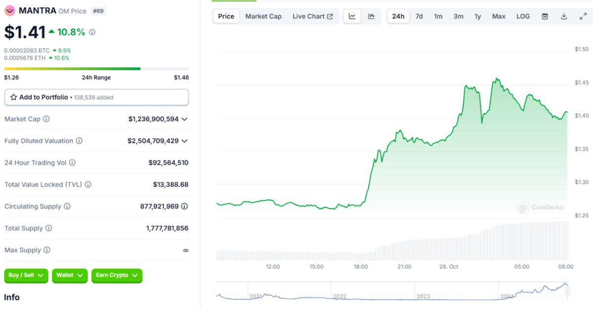 Kriptokoin.com olarak da bildirdiğimiz gibi MANTRA (OM), son dönemlerde yatırımcıların ilgisini çekmeye devam ediyor. Fiyatı ise son 24 saatte %12 artarak 1,42 dolara çıktı ve dikkatleri üzerine çekti. OM’nin gün içindeki en düşük fiyatı 1,26 dolar, en yüksek fiyatı ise 1,46 dolar olarak kaydedildi. Diğer yandan, ORDI coin %4 artışla 33,15 dolara çıktı. Aerodrome Finance (AERO) ise %2,5’lik bir artışla 1,22 dolara ulaştı. Bu yükselişler, yatırımcıların gözdesi haline gelmiş durumda.