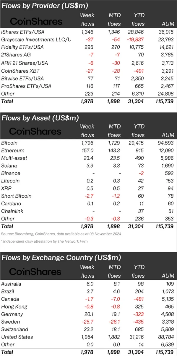 ABD seçimlerinin ardından kripto para varlık yatırım ürünlerine büyük bir ilgi artışı yaşandı. CoinShares verilerine göre 1,98 milyar dolar tutarında bir giriş var idi. Bu,, küresel Yatırım Yönetimi (AuM) miktarını 116 milyar dolara çıkararak yeni bir rekor kırdı. Bitcoin, bu yükselişe öncülük ederken, Ethereum da Temmuz’dan bu yana en yüksek girişleri gördü. Makroekonomik gelişmeler ve ABD’deki politik değişimler, yatırımcıların kripto varlıklara olan ilgisini artırdı. Ayrıca, İsviçre ve Almanya gibi diğer bölgeler de bu girişten payını aldı.
