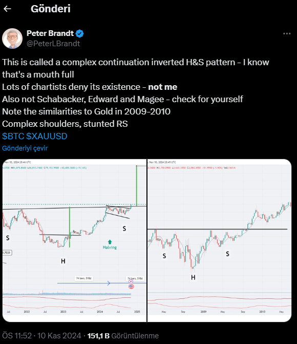 Bitcoin’in (BTC) fiyatı, ay başından bu yana birçok tüm zamanların en yüksek seviyesini (ATH) kaydettikten sonra 80.000 dolarlık fiyat seviyesinin üzerinde işlem görmeye başladı. Yazının yazıldığı sırada, Bitcoin’in fiyatı 81.182,21 dolar seviyesindeydi ve son 24 saatte yüzde 2,82 artış gösterdi. Bu yükselişin ortasında, efsanevi yatırımcı Peter Brandt, BTC fiyatlarını daha da yukarı çekebilecek nadir bir desenin altını çizdi. Peter Brandt, X platformundaki paylaşımında, Bitcoin ve Altın’ı içeren iki grafik paylaştı. Bitcoin grafiğini, ters baş ve omuz (H&S) deseninin karmaşık bir devamı olarak etiketledi. Pek çok grafik uzmanının, bu nadir desenin varlığını reddettiğini, ancak oldukça belirgin olduğunu belirtti.