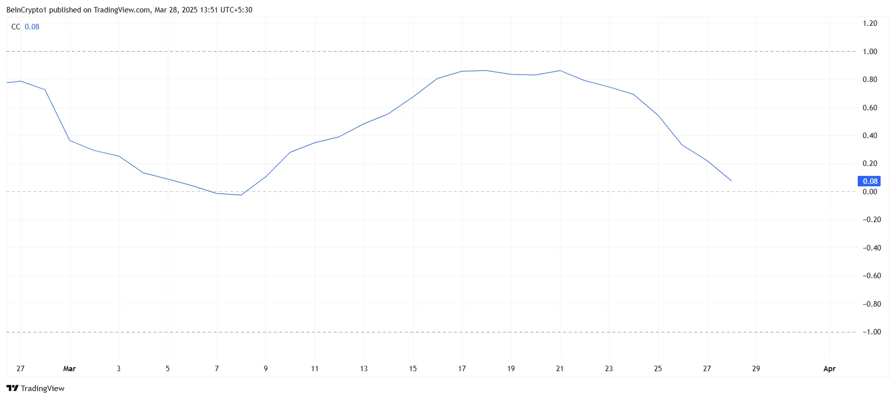 HBAR ile Bitcoin arasındaki korelasyon 0.8 seviyesine düşerek negatif bölgeye yaklaşmaya başladı. Bu durum, HBAR’ın Bitcoin’in hareketlerinden ayrışmaya başladığını gösteriyor. Korelasyon zayıflamaya devam ederse, HBAR Bitcoin’in 85 bin üzerinde istikrar sağlamasından tam olarak faydalanamayabilir.