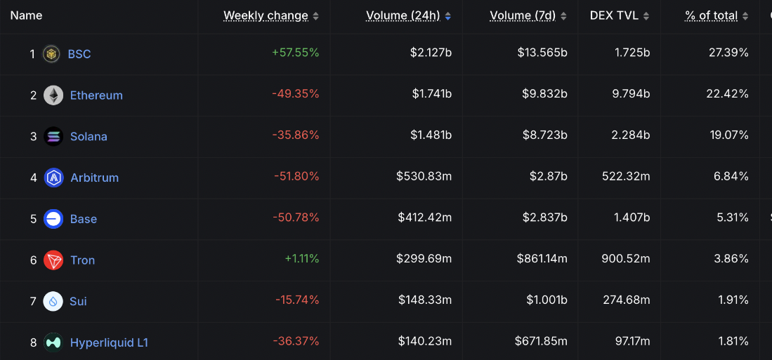 Binance ile bağlantılı olan BNB Chain, merkeziyetsiz borsa (DEX) piyasasında büyük bir atılım yaparak Ethereum ve Solana’yı geride bırakmayı başardı.