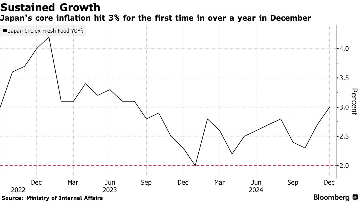 Japonya’nın temel enflasyon göstergesi son 16 ayda ilk kez %3’e ulaşarak, ülkedeki fiyat ivmesinin devam ettiğinin altını çizdi. Taze gıda hariç tüketici fiyatları Aralık ayında bir önceki yıla göre %3 artarak, bir önceki ayki %2,7’lik seviyesinden enerji maliyetlerindeki artışa bağlı olarak hızlandı. Okuma, fikir birliği tahminiyle eşleşti ve Ağustos 2023’ten bu yana ilk kez %3’e ulaştı.