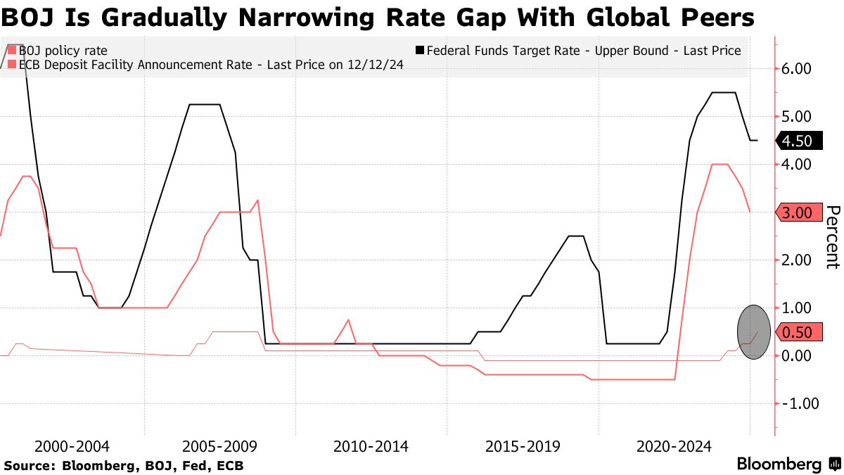 Faiz artışı bir açıdan, ABD Merkez Bankası ve Avrupa Merkez Bankası borçlanma maliyetlerini düşürürken ya da sabit tutarken BOJ’un faiz artıran tek büyük merkez bankası olarak aykırı konumunu bir kez daha ortaya koyuyor.