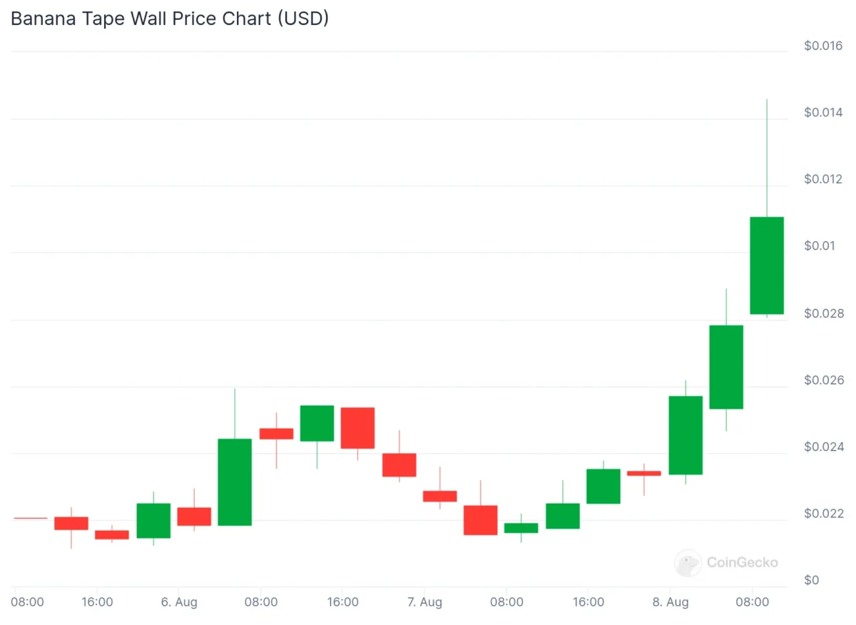 Solana meme coin’leri, dogwifhat (WIF), Bonk Inu (BONK)’un yükselişinin ardından piyasanın odak noktası oldu. Şimdi ise yeni bir Solana tabanlı meme coin patlama yaşadı. Ancak bu durum, Banana Tape Wall (BTW) gibi bazılarının sunabileceği pek bir şey olmadığı için her yeni trend meme varlığını sahip olunması gereken bir varlık haline getirmiyor.