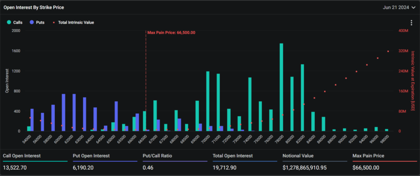 Kriptokoin.com’dan takip ettiğiniz üzere, piyasa hafta içinde ileri geri gidip geldikten sonra düşüşe geçti. Lider kripto Bitcoin 65 bin dolar seviyesinin altına düşerken, lider altcoin Ethereum 3.500 doları kaybetti. Bugün vadesi dolan Bitcoin opsiyonlarının nominal değeri 1,27 milyar dolar. Vadesi dolan bu 19.712 sözleşmenin put/call oranı 0,46. Ayrıca, BTC için maksimum acı noktası 66.500 dolar.
