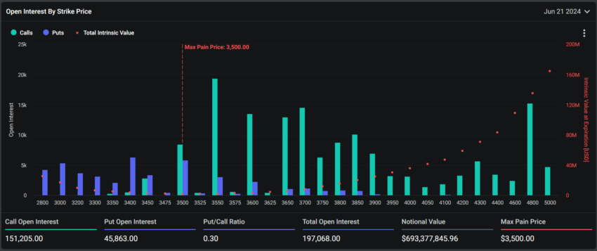 Süresi Dolan Bitcoin Opsiyonları. Kaynak: DeribitOpsiyon ticareti bağlamında, maksimum acı noktası opsiyon sahipleri için maksimum finansal acıya neden olan fiyat seviyesini temsil eder. Bu arada, put-call oranı, alım opsiyonlarının (call) satım opsiyonlarına (put) göre daha yaygın olduğunu gösteriyor. Öte yandan, Ethereum’un 693,37 milyon dolar nominal değere sahip 197.068 sözleşmesi bulunuyor. Süresi dolan bu sözleşmelerin put/call oranı 0,30 ve maksimum acı noktası 3.500 dolar.